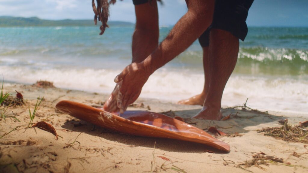 Artist, Dean Biŋkin Tyson, on Country, 2026 (Still). Image courtesy of Seth LeBrese.